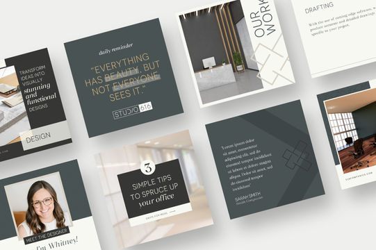 The custom Studio 616 brand mark is a nod to both architecture and interior design with it’s geometric shapes giving the look of layered swatches or tiles, and a lighter color underneath to give the illusion of depth and texture.
